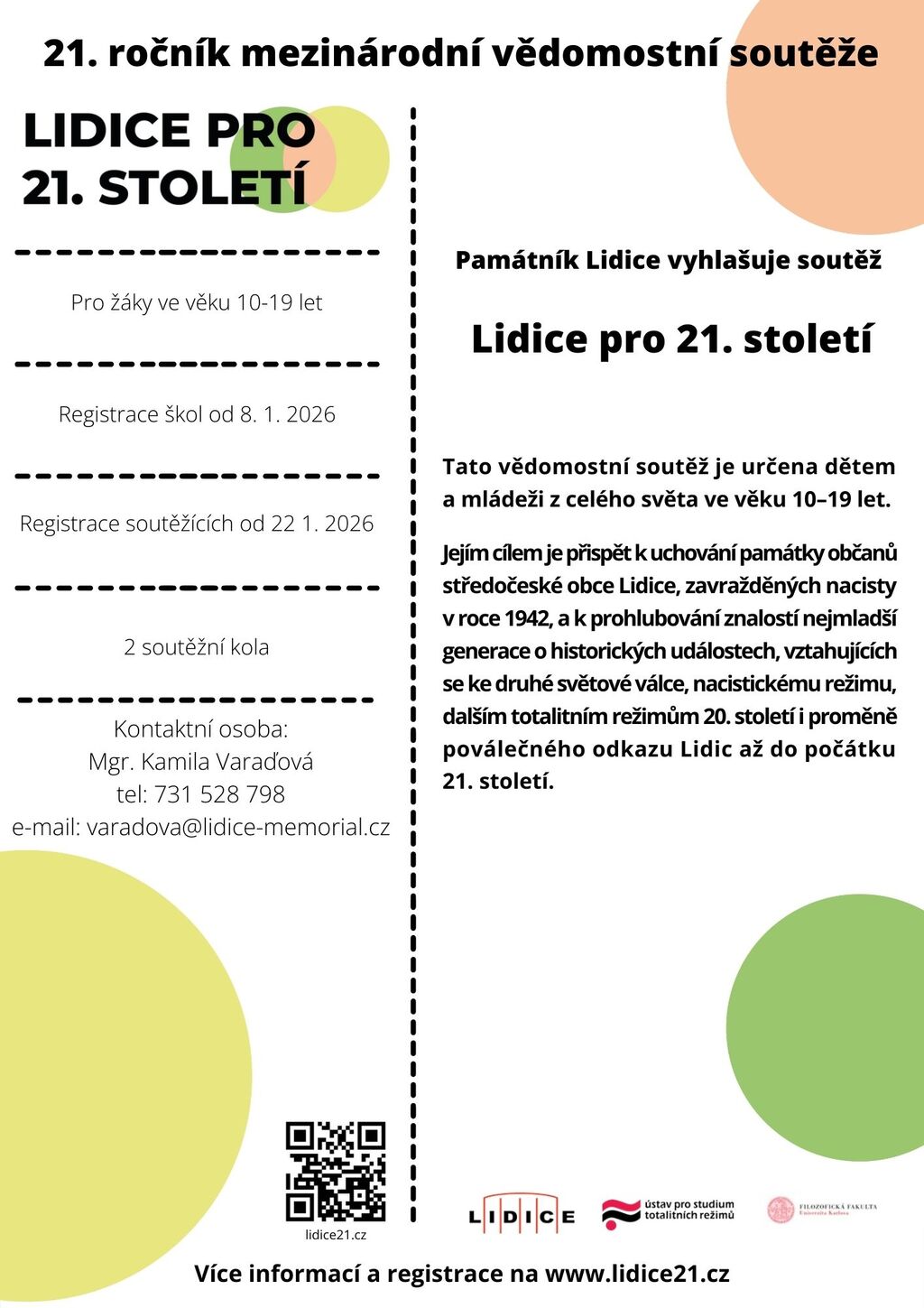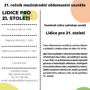 V lednu nového roku 2026 bude zahájen již 21. ročník mezinárodní vědomostní soutěže „Lidice pro 21. století“, kterou společně vyhlašují Památník Lidice, Ústav pro studium totalitních režimů a Filozofická fakulta Univerzity Karlovy. Je určena žákům a studentům ve věku 10–19 let ze škol v České republice i ze zahraničí a jejím cílem je rozvoj povědomí o moderních dějinách, podpora kritického myšlení, práce s prameny a zároveň motivace pro mládež k samostatnému tvořivému projevu. Záštitu nad tímto projektem opět převzali ministr kultury, ministr školství, mládeže a tělovýchovy, ministryně obrany a hejtmanka Středočeského kraje.