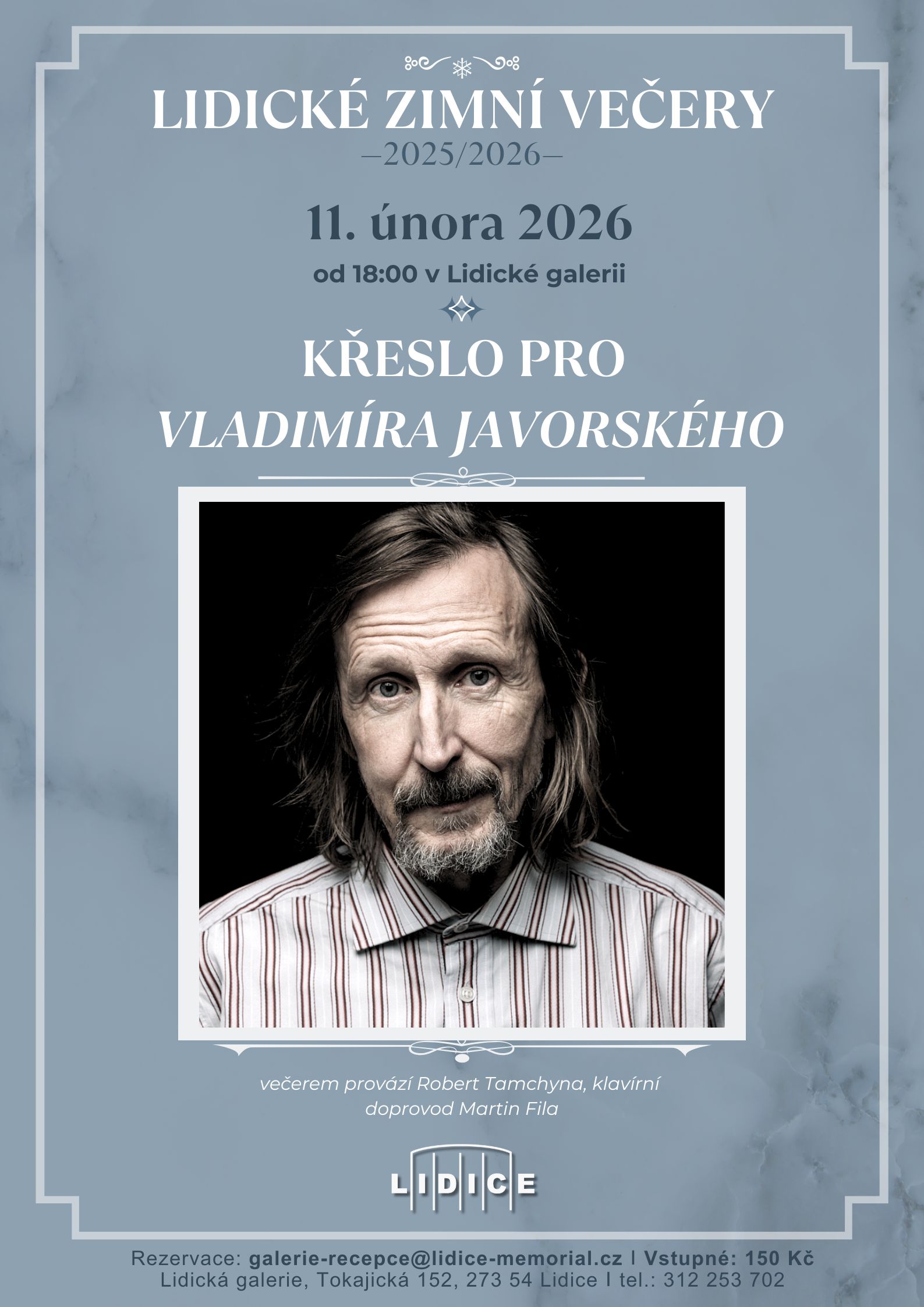 Srdečně Vás zveme na v pořadí již šestý pořad z cyklu Lidické zimní večery! Do našeho Křesla pro hosta tentokrát usedne Vladimír Javorský, jeden z nejvýraznějších českých divadelních a filmových herců.
