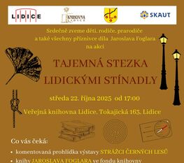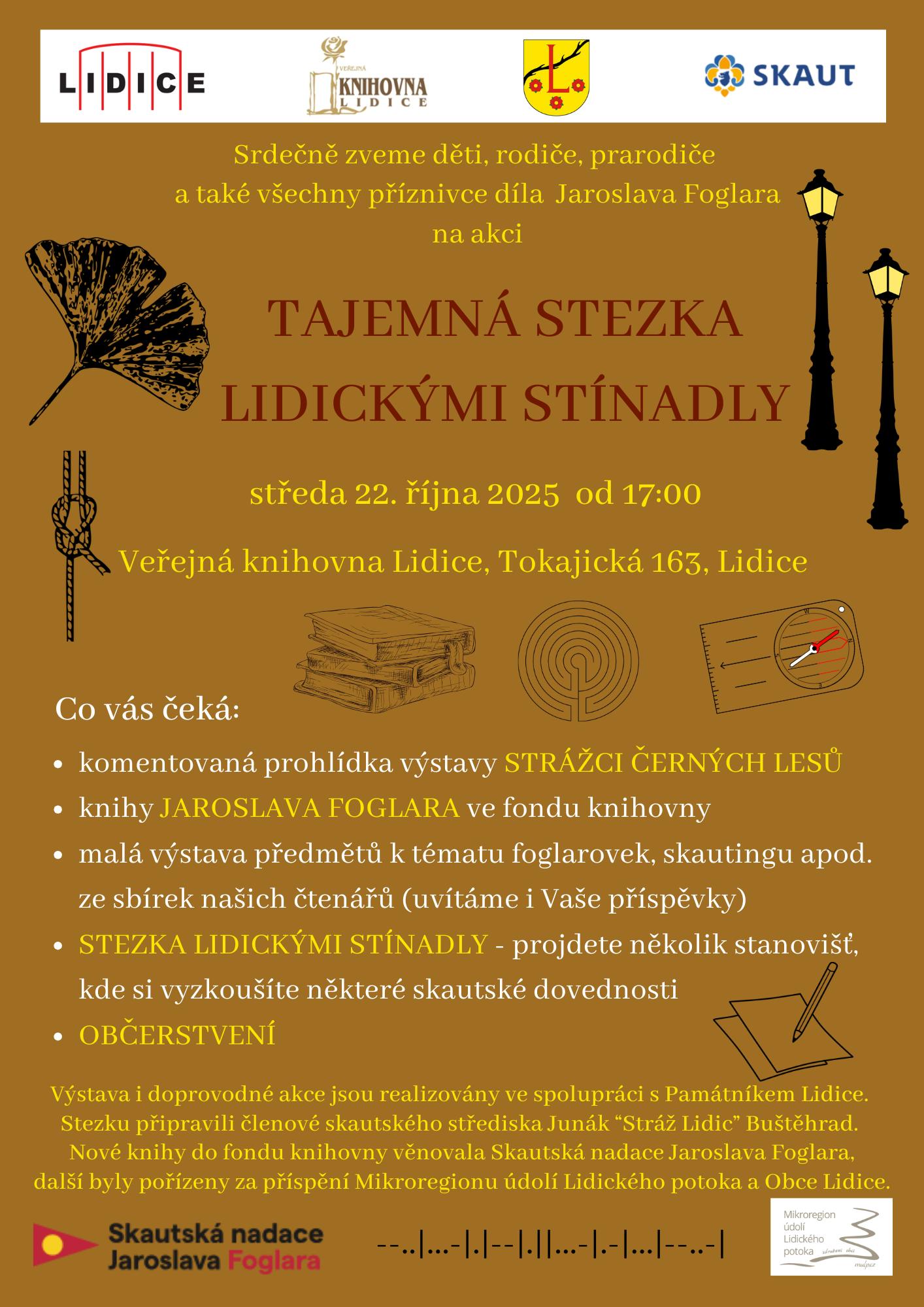 Srdečně zveme všechny příznivce díla Jaroslava Foglara a celé rodiny na výstavu spojenou s originálním doprovodným programem, kterou spolupořádá Památník Lidice. Tajemnou stezku Lidickými stínadly připravili členové skautského střediska Stráž Lidic Buštěhrad, nové knihy do knihovního fondu věnovala Skautská nadace Jaroslava Foglara a další přírůstky byly pořízeny za přispění Mikroregionu údolí Lidického potoka a Obce Lidice.